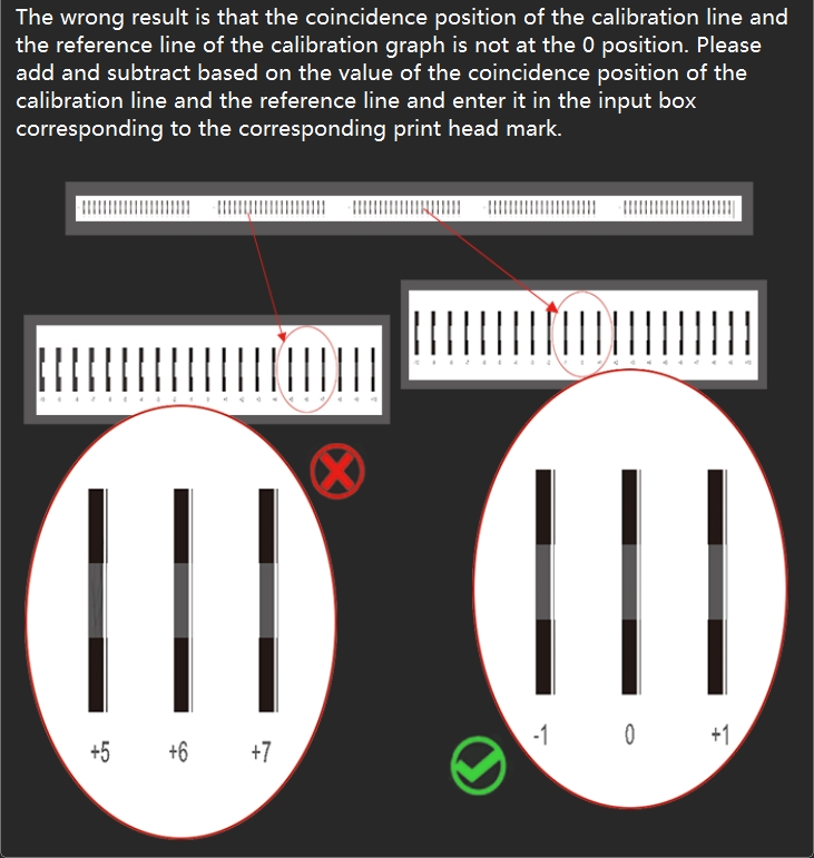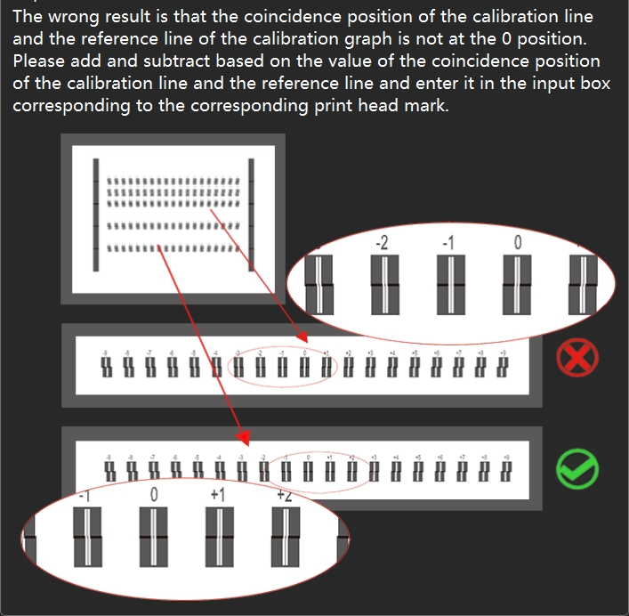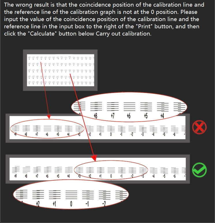 Print the calibration chart line of "Step Adjust - Base Step" and check that the base step calibration line is aligned at position 0. If the calibration line is actually aligned at +1, enter "+1" in the pixel box, then click "Calculate", then click "Save" in the upper right corner to save the calibration parameters. If the calibration line is actually aligned at -1, enter "-1" in the pixel box, then click "Calculate", then click "Save" in the upper right corner to save the calibration parameters. Modify the values and print the calibration chart again to see if the 0 position of the calibration line is aligned.
