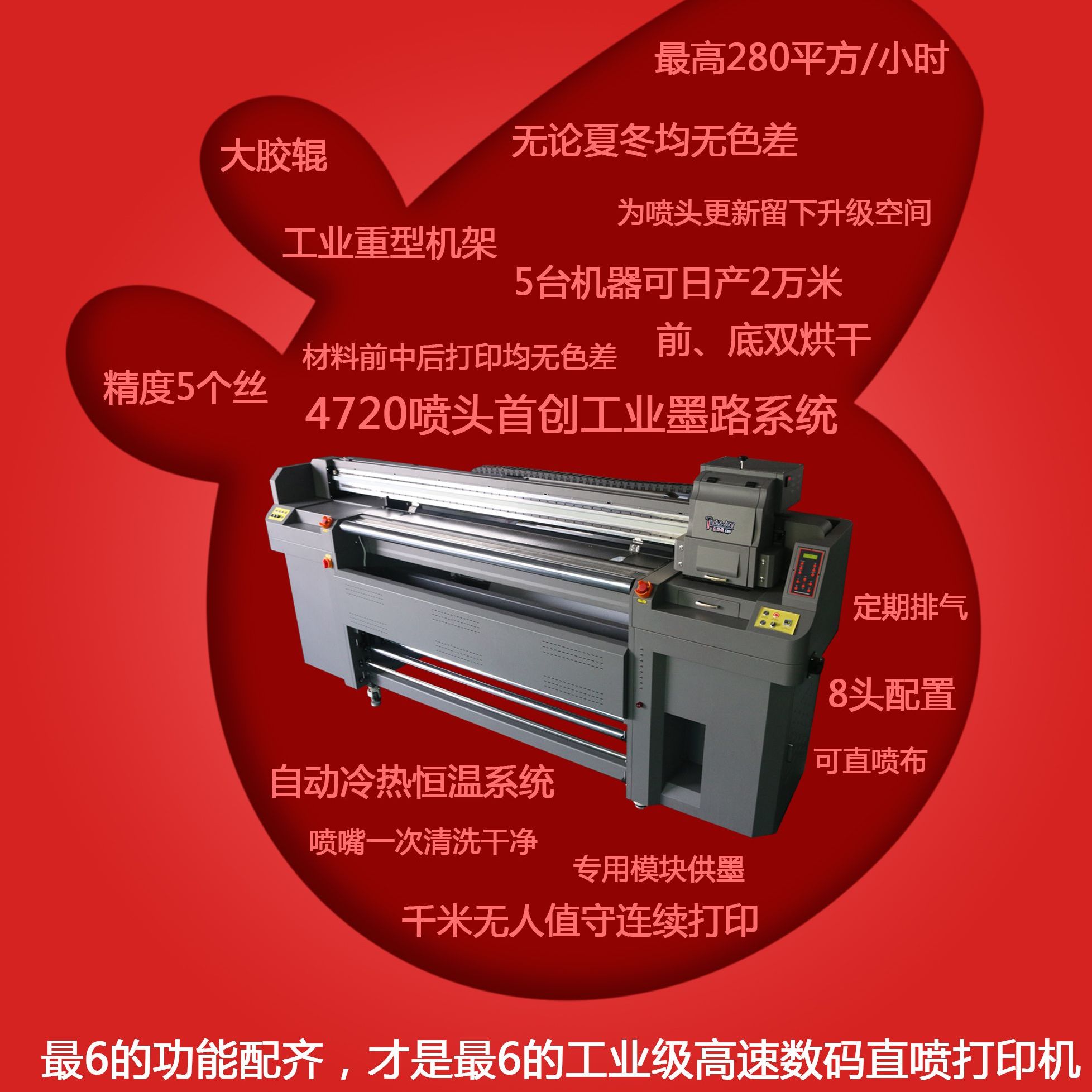 現(xiàn)在的數(shù)碼印花機更新?lián)Q代得比較快,越來越往高速印花機發(fā)展。而現(xiàn)在一些新上市的數(shù)碼印花機不但打印速度更快,而且還能自動一次清洗干凈噴頭,無需多次清洗,這樣能大大節(jié)省墨水。最為具有代表性的就是泰拓8頭印花機,供墨系統(tǒng)有發(fā)明專利,清洗噴頭可以一次完成清洗干凈,節(jié)省了不少墨水。因此,如果上述三種方法都無法有效節(jié)省墨水時,不妨考慮換新一代8頭印花機。