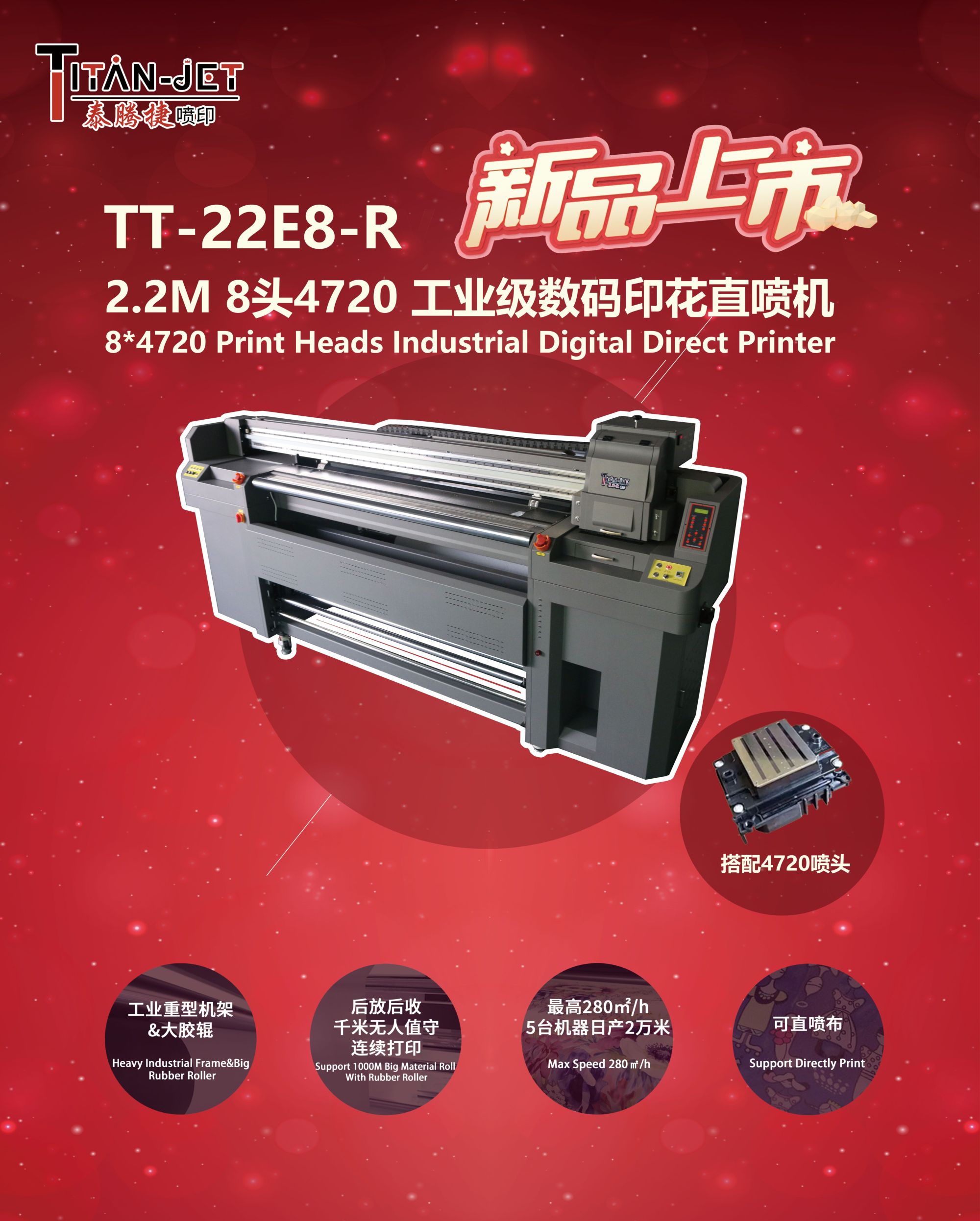 至于八頭印花機,由于多噴頭打印伴隨而來就是打印質(zhì)量和穩(wěn)定性會多出一些不確定因素,因此市面上多噴頭穩(wěn)定打印的機器不多,由于部分廠家研發(fā)實力不足所以無法研發(fā)出多噴頭機器。目前市面上較為常見的就是泰拓八頭印花機,與兩頭及三頭、四頭機器不同的是,泰拓八頭印花機采用的是2.2米工業(yè)級重型機架,采用大膠輥走紙而不是壓紙輪,且供墨用的是工業(yè)墨路系統(tǒng)而不是直插式墨囊。因此這款機器適合中大型廠家的中等到大批量的生產(chǎn)。