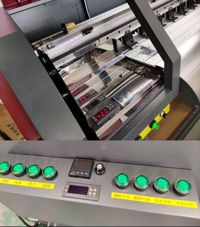 4、泰拓科技的抖粉機(jī)采用導(dǎo)帶式傳送,方便打樣,加熱烘干一體化,烘焙均勻,增加圖案的牢度。