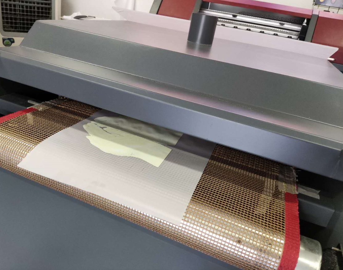 4、通過導帶傳送進行圖案的熱熔粉加熱,增加圖案的水洗牢度,整個過導帶的時間大約2—3分鐘,導帶式傳送會讓加熱烘焙更加的均勻。