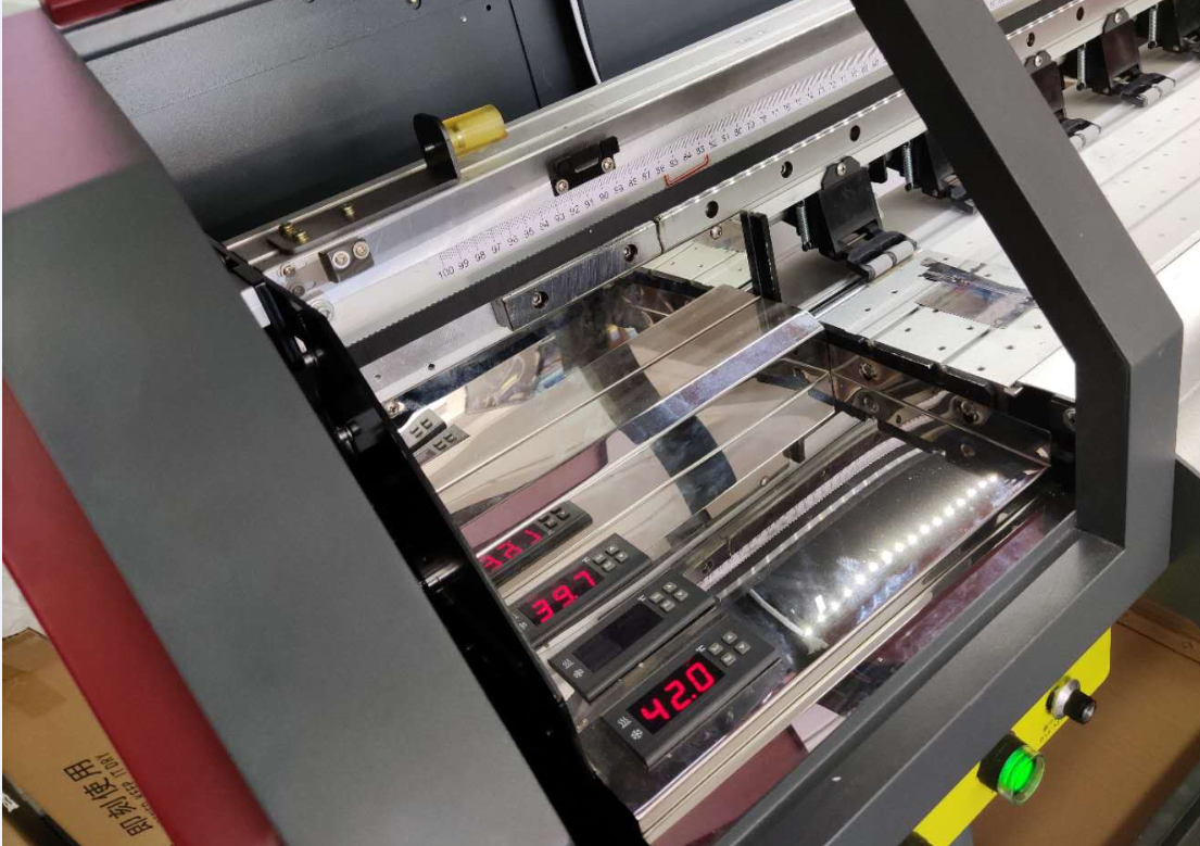 1、打印機(jī)上有前中后3段式烘干,打印機(jī)的左側(cè)有專門的溫度控制開關(guān)和溫度顯示屏,承托打印耗材的模具一體化平臺下方就是烘干系統(tǒng),摸起來是溫?zé)岬摹T诖蛴〉臅r候,就能夠?qū)D案進(jìn)行烘干。