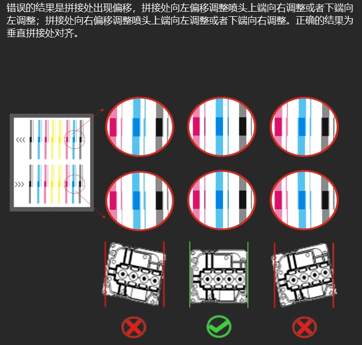 打印 "噴頭安裝-垂直檢查" 校準(zhǔn)圖,檢查打印頭是否安裝垂直,手動調(diào)整打印頭垂直角度。