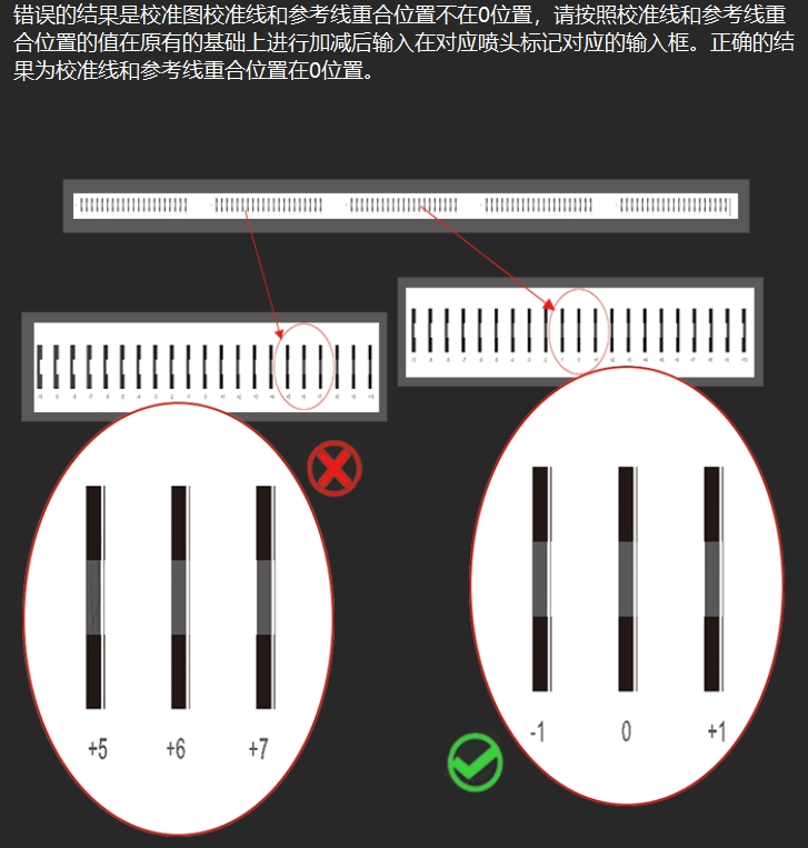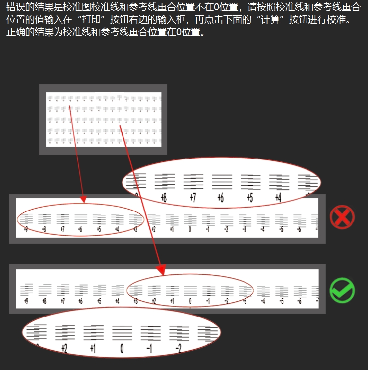 修改數(shù)值,再次打印校準(zhǔn)圖,查看校準(zhǔn)線條的0位置是否對齊。