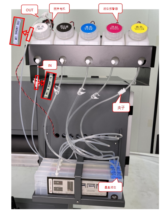 安裝固定主墨桶支架螺絲,然后將墨桶擺放整齊,并連接相應(yīng)的墨桶和相應(yīng)的標記墨管。