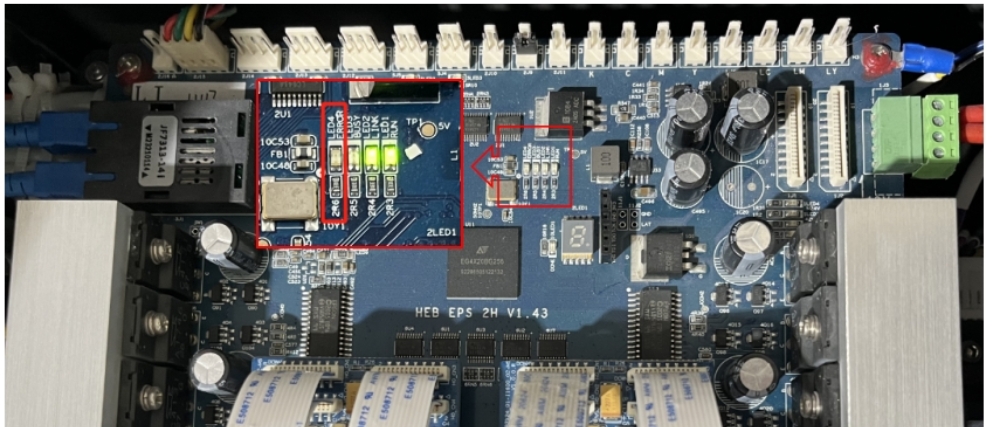 確認打印頭數(shù)據(jù)線連接正確后,開機,觀察車頭板上的“ERROR”燈是否亮。 如果燈亮,則為異常。立即關(guān)閉電源并檢查。