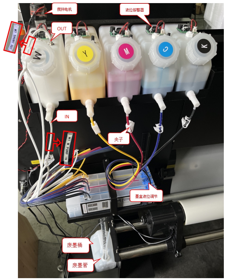 標簽為“W1 W PUMP IN”的墨管連接到白墨墨桶的下端;